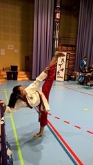 Lohjalaiselle vasta 12-vuotiaalle Naam Suomalaiselle on myönnetty harvinainen toisen asteen musta vyö taekwondossa viime viikonloppunaMUDO Lohjan harrastajia osallistui 29.-31.5. Ruotsin Trosassa pidetylle MUDO Akatemian mustien vöiden leirille. Leirin päätteeksi oli mustille vöille vyökoe ja MUDO Lohjan edustajille myönnettiin uusia mustia vöitä. Naam ja 46-vuotias Vesa Suomalainen saivat molemmat toisen asteen mustat vyöt. Vesalla on vyötäröllään aikuisten mustavyö eli 2.Dan ja Naamilla alle 15-vuotiaiden 2.Poom vyö, joka vaihtuu automaattisesti 2. Dan vyöksi Naamin täytettyä 15-vuotta. Naamin osalta suoritus on merkittävä, kun tuon vyöarvon on suorittanut alle 13-vuotiaana aikaisemmin vain yksi suomalainen, Daniel Halonen, Porista. Esimerkiksi Lohjalaisillekin tuttu viimevuoden MM-kilpailuissa pronssia saavuttanut Frans Salmi on saanut oman 2. asteen mustan vyönsä 14-vuotiaana, joka on myös huippusuoritus. Myös Mudo Lohjan 12-vuotias Keni Suomalainen ja 45-vuotias Timo Jansson suorittivat 1. asteen mustat vyöt. - Samalla seuramme mustienvöiden omaavien ohjaajien ja ohjaaja-apulaisten määrä nousi kahdella henkilöllä. Pystymme jatkossakin tarjoamaan laadukasta harjoittelua alueemme junnuille. Nuoret ja lahjakkaan harrastajamme ovat hyviä esimerkkejä ikäisilleen ja nuoremmilleen. Vertaisopetus on myös hyvin edistävää nuorella iällä, kun taitava lajin harrastaja kykenee tukemaan oman ikäisiään harjoituksissa. Seuramme aloituskursseilla Naam ja Keni ovat mukana opastamassa myös uusia harrastajia, kertoo MUDO Lohjan pääopettaja Vesa Suomalainen. - Minua eniten jännitti murskausosuus, kun sain tehdä avokämmenellä voimamurskauksen 3 senttiä paksuun liimapuulevypinoon. Se piti saada halki yhdellä kämmensyrjä iskulla. Tovin epäröin ja käytin aikaa varmaan pariminuuttia oikean asennon hakemiseen. Asennon, josta saan mahdollisimman pitkän, nopean ja voimakkaan vauhdin juuri ennen käteni osumista levypinoon. Kun löin, niin suljin silmäni juuri ennen osumista ja tunsin kun koko pino halkesi. Olin yllättynyt kuinka se onnistui. Tunsin kyllä iskun jälkeen kädessäni, että olin kovaan lyönyt ja annoinkin saman tien kylmä hoitoa kädelleni, kertoo Keni pilke silmäkulmassa.. Naam jännitti myös eniten omaa murskausosiotaan. Hänen piti tehdä pitkä murskaussarja, jossa on yhteen menoon murskattava 6 eri kohdetta. Koko sarja alkoi hyppyetupotkulla, jossa kohde on käsi suoraan ylöspäin osoitettuna, sormenpäiden korkeudella. Sen jälkeen toinen potku ja kaksi käsitekniikkaa. - Ne olivat kaikki yllättävän helppoja. Seuraavat kaksi potkua olivat myös kohtuu helppoja, ja puun kappaleet lensivät pitkin seiniä potkujeni voimasta. Lopussa oli voimamurskausosa, jossa kyynärpäällä piti murskata kolmen sentin liimapuulevy. Kyllä sekin meni kun antoi samalla tunteella palaa, mitä edellisissäkin käytti. Olin todella yllättynyt, miten murskaus osuus meni ja jääpusseilla sain nyrkkiäni vyökokeen jälkeen jäähdytellä. Vielä 4 päivän päästäkin ovat rystyseni tummana. Hah näkisittepä iskän kyynärpään, sanoo Naam lopuksi hymyillen. MUDO Lohjan harrastajien vyökokeen ottivat vastaan kaksi lajin Mestaria Ji-Pyo Lim and Rahel Azad joilla on molemmilla 7.Dan musta vyö sekä Lars Wiberg jolla on 3.Dan musta vyö. Samassa vyökokeessa oli 38 henkilöä yrittämässä mustaa vyötä tai olemassa olevan vyön korottamista, ja siinä suurin osa onnistuikin. Muutama sai kotiläksyksi lisää harjoittelua vielä ennen uuden vyön saamista, kertoo Mestari Lim. Mestari Lim kävi myös Lohjalla torstaina 4.6. ja piti MUDO Lohjan harrastajille vyökokeet. 13 lajin harrastajaa saikin uuden vyöarvon. Mestari Lim kehui jokaisen suorituksia antaen samalla myös neuvoja siitä, mihin kannattaa kiinnittää huomiota jatkossa. - Taekwondo on lajina hyvin monipuolinen. Siinä kehittyy henkisesti ja fyysisesti. Kaikki lähtee siitä että yritämme ja teemme parhaamme. Harjoittelu kehittää motoriikkaa, ketteryyttä, voimaa ja koordinaatiota sekä antaa iloisen mielen. Samalla sisäinen voima, keskittymiskyky sekä itsekuri kasvavat. Vyökokeet ovat välietappeja ja jokainen uusi vyöarvo on osoitus siitä että on saavuttanut oppimisessa uuden tason. Se myös tarkoittaa sitä, että ei saa unohtaa aikaisemmilla tasoilla opittuja asioita, kertoi Mestari Lim osallistujille ennen uusien vyöarvojen myöntämistä. Hän myös antoi viimeisenä ohjeena kaikille. - On tärkeää ette harjoittelemme oikein, katsokaa mallia Naam potkuista. Pyrkikää kaikki samaan, ja älkää tyytykö edes siihen, vaan yrittäkää tehdä vieläkin paremmin. Niin teistä kaikista tulee joskus Taekwondon mestareita. Itsekin olen harrastanut lajia nyt 40-vuota ja vielä minullakin on opittavaa, kertoi Mestari Lim hymyileville harrastajille. Viikonlopuksi MUDO Lohjan Mestari ja Suomen maajoukkueen päävalmentaja Mestari Lim suuntasi Turkuun jakamaa oppejaan, jossa Suomen maajoukkue valmistautuu 26.-28.6. Serbiassa pidettäviin Euroopan Mestaruuskilpailuihin.