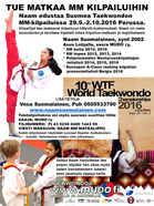 Suomen Taekwondoliiton valitsema 12 urheilijan maajoukkue vuoden 2016 MM-kilpailuihin on Nimi / Sarja Naam Suomalainen / Cadet Female Eevi Huuskonen / Female U 17 Essi Labart / Female U30 Johanna Nukari / Female U40 Niina Virtala / Female U50 Christian Kamphuis / Freestyle Male O18 Christian Kamphuis & Essi Labart / Freestyle Pair O18 Veeti Koivistoinen / Male U17 Frans Salmi / Male U30 Sauli Aalto-Setälä / Male U40 Kim Rejman / Male U50 Matti Huuskonen / Male U60 Eevi Huuskonen, Veeti Koivistoinen / Pair U17 Christian Kamphuis & Essi Labart / Pair U30 Niina Virtala, Johanna Nukari & Triin Saviauk / Team Female O30 Jeppe Aukio, Kim Rejman, Sauli Aalto-Setälä / Team Male O30 (U=under)