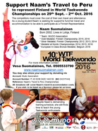 Naam Suomalainen on valittu maajoukkueeseen edustamaan Suomea Taekwondon Liikesarjojen MM-kilpailuissa Perussa 2016