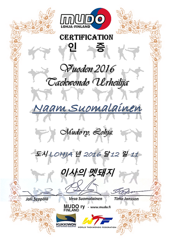 11.12.2016 valittiin uusi hallitus ja päätettiin jäsenmaksuista. Kokous hyväksyi yksimielisesti hallituksen esityksen mukaisesti:1. Toimintasuunnitelman.2. Tulo- ja menoarvion.3. Varsinaisten jäsenten liittymismaksut (30 € /joka voidaan sisällyttää aloituskurssin maksuun)4. Varsinaisten jäsenten jäsenmaksut (30 eur € /vuosi jokaiselta jäseneltä)5. Varsinaisten jäsenten harjoittelumaksu (Alle 12-v lapset 130 eur € /vuosi 12-v ja yli 160 eur/vuosi)6. Perhealennus 2. ja 3. samasta perheestä -50 eur sekä 4. ja siitä enemmän ilman harjoitusmaksa.7. Seuran vakiovuorojen valmentajat, joille ei ole maksettu palkkiota, ei peritä harjoittelumaksua.8. Kannattavien henkilöjäsenten vuotuinen ja kertakaikkinen jäsenmaksu (200 € /vuosi tai 1000 €/kerta)9. Kannattavien yhteisöjäsenten vuotuinen ja kertakaikkinen jäsenmaksu (200 € /vuosi tai 2000 €/kerta)Vuodelle 2017 valittiinpuheenjohtajaksi Vesa Suomalainen sekähallituksen jäseniksiTimo Hyvärinen, Mika Ruotsalo sekä Lauri Fellman.Yhdistyksemme vuoden 2017 Toiminnantarkastajaksi valittiinHannu ja Sari Hirsivaara sekä varalle Timo Jansson.Lisäksi julkistettiin vuoden 2016 harrastajat.Vuoden juonioriharrastaja Lilja Patricio,Vuoden aikuisharrastaja Maria Ankkuri,Vuoden tsemppari Ivan Botskarjov,Vuoden Taekwondo urheilija Naam Suomalainen. |