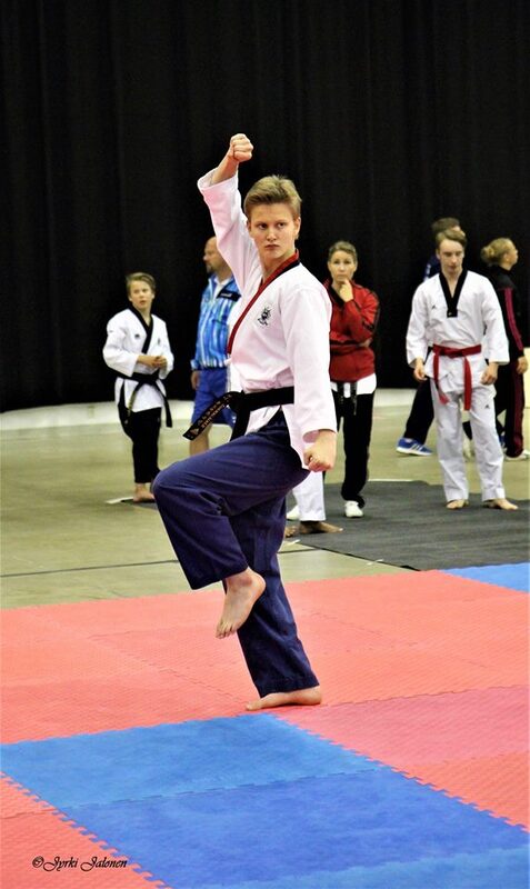 SM-KILPAILUISTA KULTA JA KAKSI HOPEAA SM-kilpailuissa juuri 15-vuotta täyttänyt Naam Suomalainen toi odotetusti mitaleita. Hän osallistui kolmeen sarjaan ja toi jokaisesta mitalin mukanaan. Tyttöjen alle 18-vuotiaiden ryhmäsarjassa tuli kultaa. Ryhmässä oli mukana Tara Tuokko Klaukkalan Taekwondosta sekä Eevi Huuskonen Espoo Hwarang Team. Naamin potkukuva (kuvaaja Jyrki Jalonen) Parisarjassa Naam oli Espoo Hwarang Teamin Mico Knutssonin kanssa, ja selvisivät semifinaalin kautta finaaliin 4 muun parin kanssa, ja sieltä nappasivat hopeaa kaulaansa. Henkilökohtaiseen tyttöjen 15-17-vuotiaiden sarjaan Naam lähti ikänsä puolesta tulokkaana haastamaan vanhempia tyttöjä. Sarjan viimevuotinen Suomen mestari Eevi Huuskonen ja Naam tuli toiseksi. Naamilla oli puhdas suoritus, ja suurin ero muodostuu voiman tuoton näyttämisessä. Sitä kautta etsitäänkin tuleviin suorituksiin ensi vuodelle uutta puhtia, kertoo Vesa.