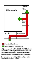 Lohjan kaupunki edellyttää 2.11.2020 alkaen kaikilta 15 vuotta täyttäneiltä kasvomaskin käyttöä. Kasvomaski tulee pukea jo ulkona, ennen rakennukseen saapumista ja sitä tulee käyttää kaikissa muissa paitsi liikuntatiloissa. KASVOMASKIEN KÄYTTÖÄ EDELLYTETÄÄN LOHJAN KAUPUNGIN SISÄLIIKUNTAAN KÄYTETTÄVISSÄ TILOISSALohjan kaupunki edellyttää 2.11.2020 alkaen kaikilta 15 vuotta täyttäneiltä kasvomaskin käyttöä kaupungin ja Lohjan Liikuntakeskuksen hallinnoimissa sisäliikuntatiloissa. Kasvomaskia tulee käyttää muulloin kuin liikuntasuorituksen aikana. Kasvomaskin käyttöä ei edellytetä henkilöiltä, jotka eivät terveydentilansa vuoksi voi maskia käyttää. Henkilön oma ilmoitus asiasta katsotaan riittäväksi. Velvoite koskee kaikkea sisäliikuntaa, esimerkiksi koulujen liikuntatilojen seura- ja harrastuskäyttöä. Myös jäähallit ovat sisäliikuntatiloja. Kasvomaski tulee pukea jo ulkona, ennen rakennukseen saapumista ja sitä tulee käyttää kaikissa muissa paitsi liikuntatiloissa (katso oheinen kaaviokuva). Liikuntatilojen käyttäjien ei tule pitää yhteisiä juomataukoja tai muita vastaavia, maskittomia kohtaamisia. Vanhempien ja muiden saattajien pääsy sisätiloihin on kielletty, ellei se ole täysin välttämätöntä. Lohjan Liikuntakeskuksen henkilöstö on velvoitettu kieltämään maskittomien henkilöiden pääsy tiloihin. Tutustu myös THL:n ohjeisiin: https://thl.fi/…/koronariskin-vahentaminen-vapaa-ajan… Lohjan Liikuntakeskus ja kaupungin pandemiajohtoryhmä tarjoavat neuvontaa ja ohjausta linjausten toteuttamiseen. Lisätietoja pandemiajohtoryhmältä Tuula Suominen Liikuntakeskukselta Toni Ojala |